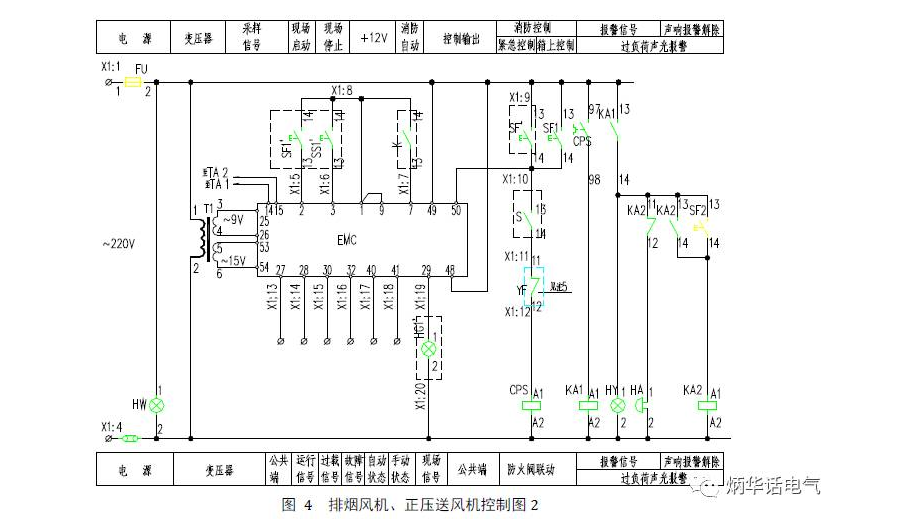 圖4是排煙風(fēng)機和正壓送風(fēng)機另一個(gè)控制方案,適合于交流380V單臺消防排煙風(fēng)機或正壓送風(fēng)機的現場(chǎng)控制或兩地控制,控制電源為交流220V,過(guò)載只報警不作用于斷電,風(fēng)口(或風(fēng)閥)上的微動(dòng)開(kāi)關(guān)直接與風(fēng)機聯(lián)動(dòng),消防聯(lián)動(dòng)模塊提供無(wú)源動(dòng)合觸點(diǎn),當消防系統提供有源觸點(diǎn)時(shí),取消變壓器T。只有控制箱上控制時(shí),取消SS1'、SF1'、S、HG1'。圖中CPS包含線(xiàn)圈、過(guò)載保護觸點(diǎn)、動(dòng)合觸點(diǎn)、動(dòng)斷觸點(diǎn)?刂破EMC是風(fēng)機專(zhuān)用控制模塊,其面板上有風(fēng)機的啟?刂萍跋嚓P(guān)信號,詳見(jiàn)《常用電機控制電路圖》10D303-2相關(guān)頁(yè)碼。當本圖用于正壓送風(fēng)機控制時(shí),將X1:11與X1:12短接。