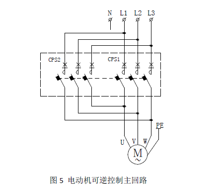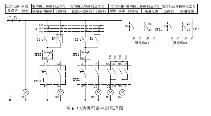 圖5和圖6分別為CPS組成的電動(dòng)機可逆控制的主回路和二次原理圖,CPS1、CPS2分別控制電動(dòng)機正轉和反轉的線(xiàn)圈,集成在CPS內,類(lèi)似分立元件構成電動(dòng)機主回路中的接觸器,CPS本身具有機械聯(lián)鎖功能,正反轉的動(dòng)斷觸點(diǎn)分別串聯(lián)在對方的線(xiàn)圈回路,形成電氣聯(lián)鎖。本方案還具有BA自動(dòng)控制功能。